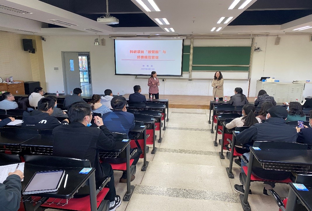 会议主要以党风廉政宣传、业务现场服务以及教职工需求调研为主。许菁处长首先为两学院教职工介绍了学校科研项目“放管服”改革举措,以及国家和学校加强廉政风险防控的政策,并重点分析了违规使用科研经费典型案例。许菁处长重点强调科研管理领域是国家反腐败重点领域之一,党中央高度重视科研领域全面从严治党和党风廉政建设工作,我校教职工要高度重视,提高站位,严明纪律,筑牢防线,严禁违规安排支出。