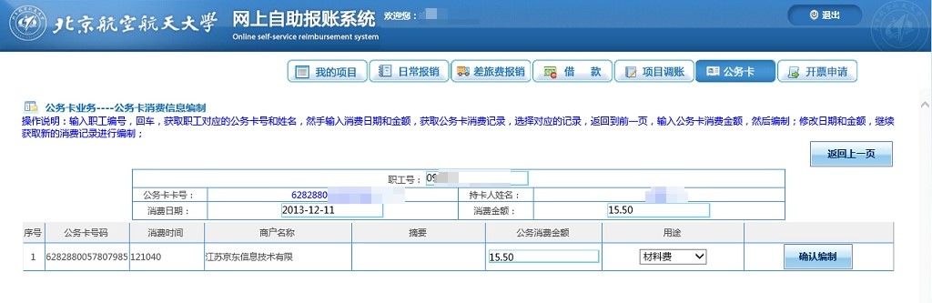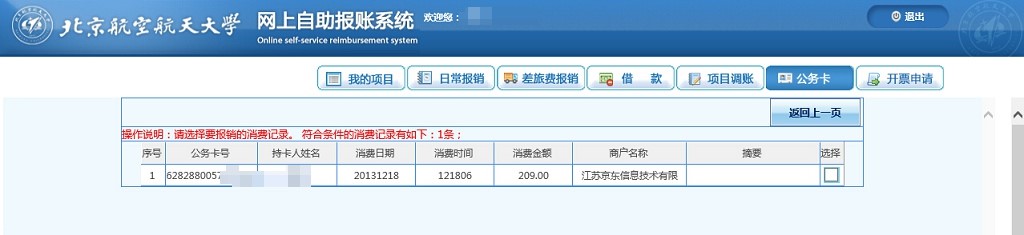 选择已编制的公务卡消费记录,确认返回报销界面完成报销单填写。