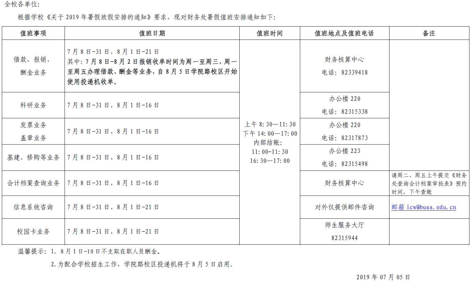 关于财务处2019年暑假值班安排的通知