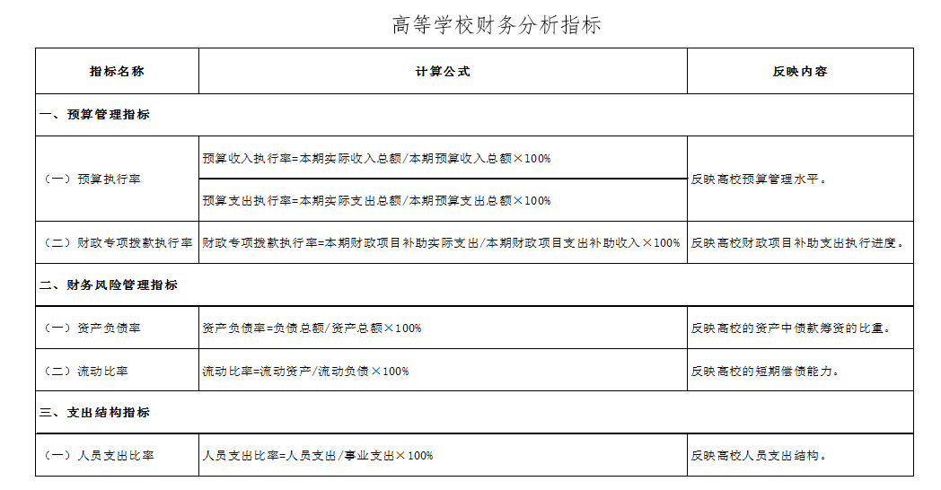 财务分析指标主要包括反映高等学校预算管理、财务风险管理、支出结构、财务发展能力等方面的指标(财务分析指标见附表)。